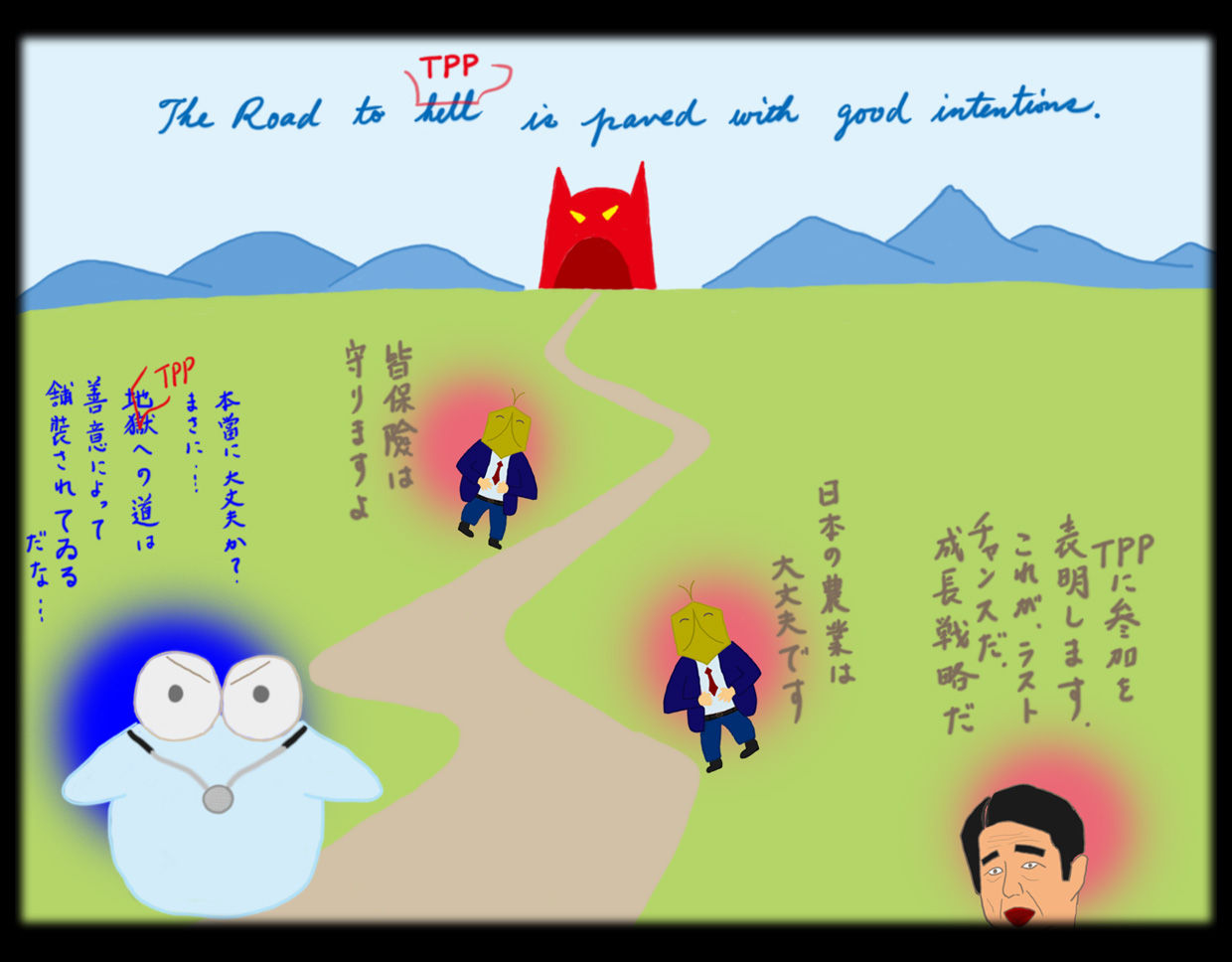 これもすべてTPPのためである。TPPがどんなものなのかは、秘密裏に交渉が進められているので、殆ど表には出て来ない。国民に隠れてこそこそと重要な取り決めを行っているのである。よほど、後ろめたいことなのだろう。まあ、漏れて来る話しを聞いても、なるほど、新自由主義者たちにとっては利権を漁れて喜ばしいものであるが、一般の国民にとって良い事等一つもないと断言できるものだ。